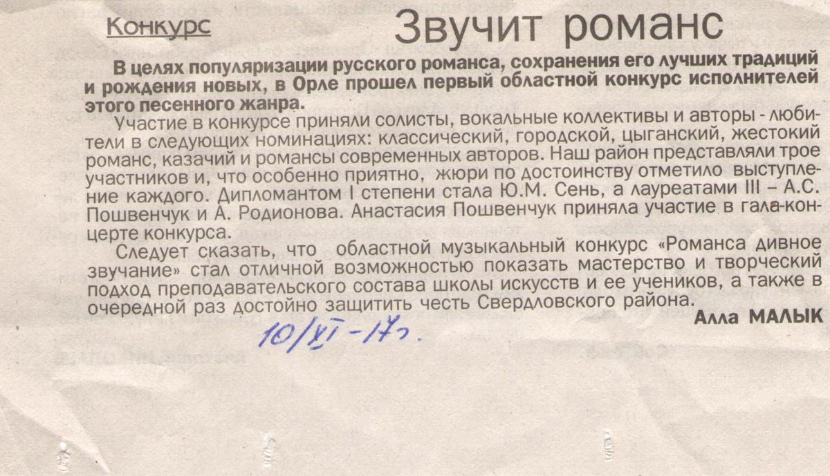 Статья в рубрике "КОНКУРС" Аллы Малык "ЗВУЧИТ РОМАНС” Сельская новь Свердловского района Орловской области №11(10612) от 10 ноября 2017 года