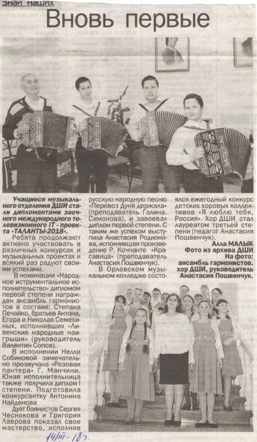 Статья в рубрике "ЗНАЙ НАШИХ" Аллы Малык “ВНОВЬ ПЕРВЫЕ” Сельская новь Свердловского района Орловской области №11(10612) от 14 марта 2018 года