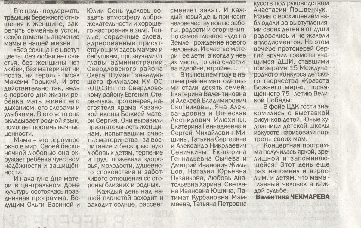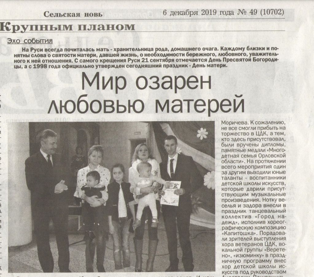 Статья Валентины Чекмаревой в рубрике "Эхо события" "Мир озарен любовью матерей" Сельская новь Свердловского района Орловской области №49(10702) от 06 декабря 2019 года
