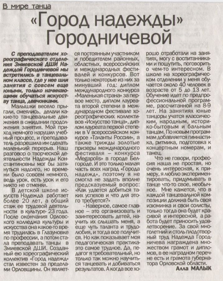Статья в рубрике "КРУПНЫМ ПЛАНОМ" Аллы Малык “"ГОРОД НАДЕЖДЫ" ГОРОДНИЧЕВОЙ” Сельская новь Свердловского района Орловской области №11(10612) от 23 марта 2018 года